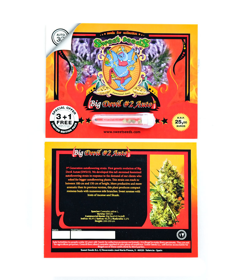 Сорт конопли Big Devil #2 Auto славится своей солидной урожайностью и высоким содержанием ТГК. Этот автоцвет от испанского сидбанка Sweet Seeds неприхотлив в уходе, устойчив к негативным факторам окружающей среды и обладает крепким иммунитетом. Оказывает комбинированный эффект.