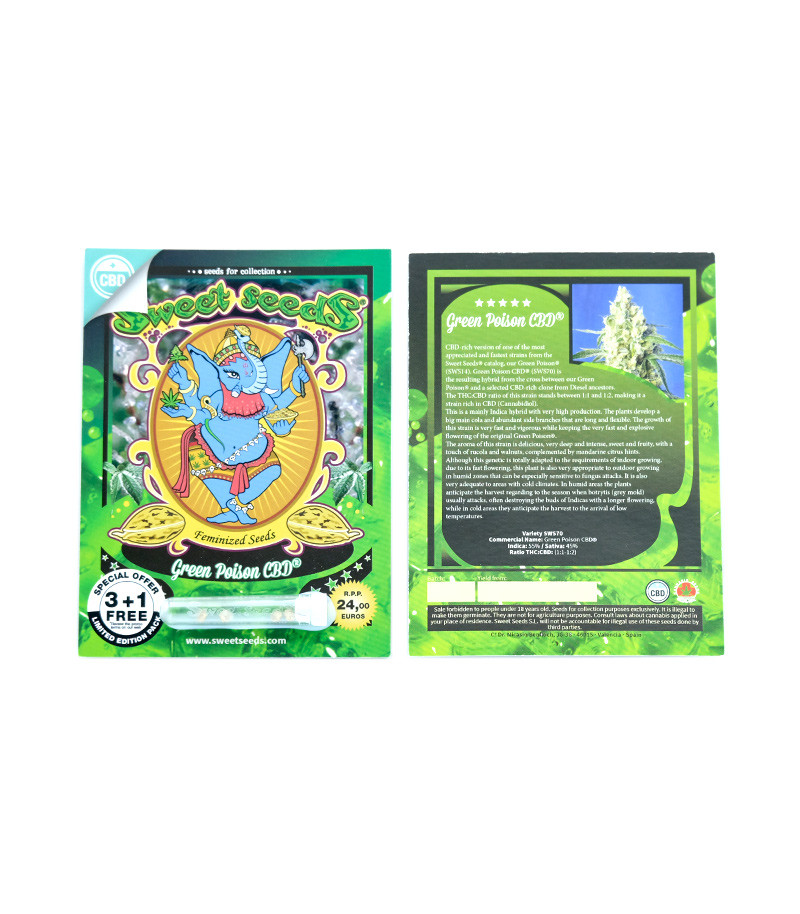 Гибрид обладает высоким уровнем производительности. Растения развивают большую основную колу и обильные боковые ветви, которые являются длинными и гибкими. Сорт каннабиса Green Poison CBD растет быстро и энергично, при этом имеет крупные шишки.