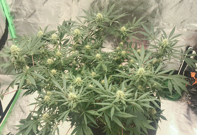 Кроме того, что на десятой неделе наконец-то началось полноценное цветение, теперь можно оценить и результаты тренировок. Напомню, я проводил LST, мейн лининг и дефолиацию без топпинга. Куст при росте 75 см (на конец 10-й недели) в ширину даже больше, чем в высоту, соцветия формируются на всех ветвях, по всей их длине. Очевидно, что количество бутонов будет очень большое.