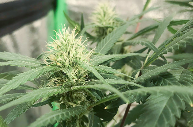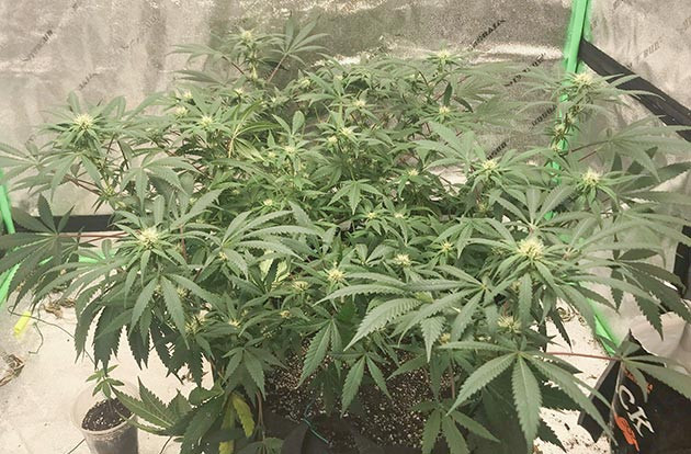 На седьмой неделе переключил режим освещения на 12/12, и… ничего не произошло. В течение первой недели растишка даже не показала признаков пола. Только через неделю начались какие-то подвижки, и стало понятно, что растение готовится к началу цветения. Полноценный же предцвет с белыми усиками и «ежиками» на верхушках ветвей начался только на девятой неделе. Рост куста – 67 см.