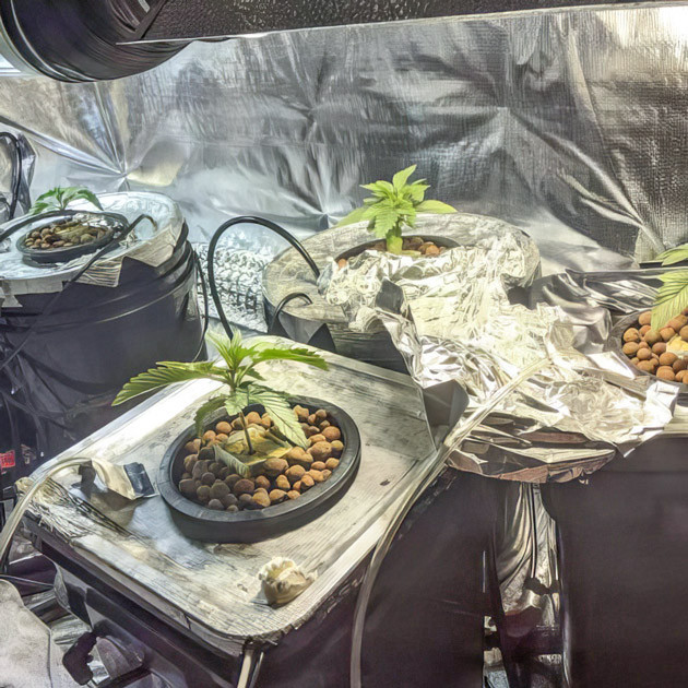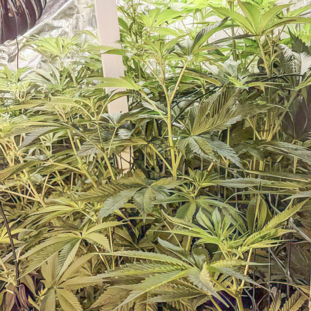 На четвертой неделе я включил вторую лампу, после этого расставил растихи в боксе таким образом, чтобы с переходом в цветение у каждой из них было достаточно места. К концу недели их рост был в районе 35 сантиметров. Листва очень широкая, с мутацией в виде девяти пальцев, тёмно-зеленого цвета. Удалил на кустиках по паре самых больших лопухов. Единственная проблема, с которой я не могу справиться, – температура раствора. Вёдра быстро нагреваются до 28-30 °C, а компот в них должен быть прохладней, около 22 °C. Впрочем, на состоянии кустиков это никак не отражается, нет признаков стресса или каких-то проблем.