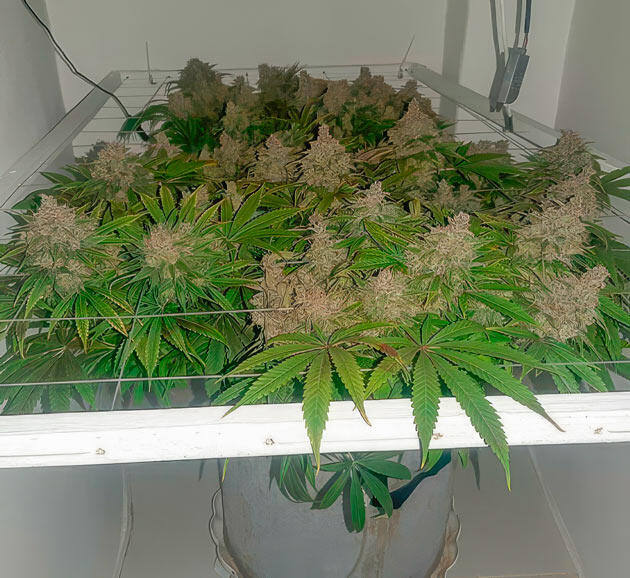 В начале девятой недели провел небольшую дефолиацию — удалил четыре лишних листа. На 59-й день передвинул под сеткой центральный побег, но в целом растение все еще выглядело маловатым для перехода на цветение. Обычно на этом сроке я уже ставлю фотикам режим 12/12, но здесь решил дать Гуле немного больше времени. На тот момент выше сетки пробивалась только центральная ветка и еще одна с противоположной стороны. Планировал завершить цикл «удобрения + чистая вода» и только затем переводить на цвет.