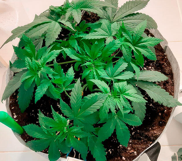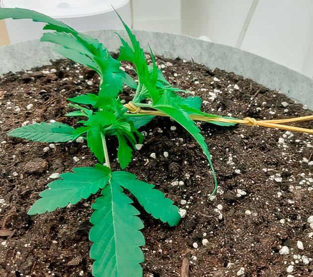 На 16-й день приступил к тренировке растения. Для фиксации использовал две резинки — слегка согнул центральный стебель. Спустя пару дней передвинул зажимы с резинками ближе к краю гроубэга, тем самым еще сильнее пригнув растение. Нижние листья аккуратно заправил, лампу поднял повыше, снизив PPFD до 256. После этого дополнительно натянул одну из резинок, закрепив за ручку горшка, и сделал более выраженный наклон. Также провел первую легкую дефолиацию: убрал пару нижних листьев и один из второй пары. Одну резинку сложил вдвое, чтобы пригнуть центр пониже, а листья спрятал под боковые побеги. Подсыпал еще немного субстрата. На фото хорошо видно, что к 21-му дню Гуля сформировала красивую структуру.