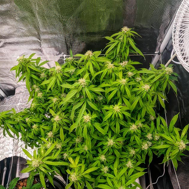 Девятая неделя, и шишки начали набирать массу. В палатке появился отчетливый аромат, не просто лёгкий травянистый флёр, а кисло-дизельный, вонючий такой запах. Немного повысил полив в сутки, до 1 литра, всё-таки шишкам нужно явно больше, чем листве. А вот веерные листья постепенно удаляю, чтобы соцветия получали больше света и не были закрыты этими лопухами. В резервуаре еще остался раствор, так как на прошлой неделе кустик пил крайне мало. Долил в него немного воды с PK 13/14 (0,5 мл/л).